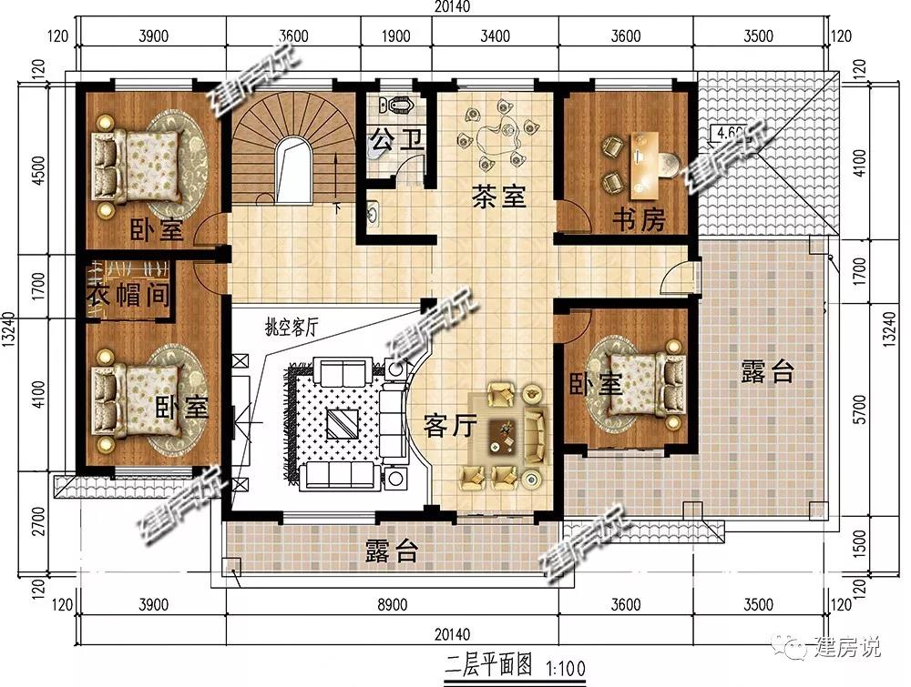 二层:3间卧室,满足一家人日常起居;客厅、茶室促进交流;卧室外的2个露台设计,让室内通风采光更佳,又可尽情欣赏乡村靓丽景色。
