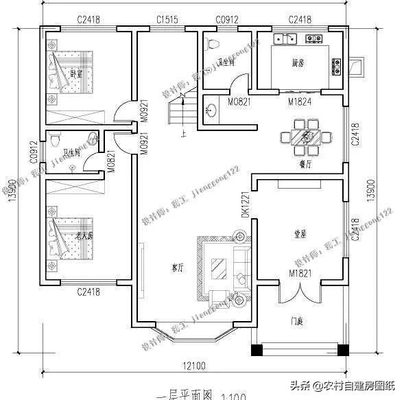 一层:入户门厅设在一侧,进门是一个堂屋,农村堂屋还是不可或缺的。客厅紧临堂屋,面积非常宽敞,农村家居待客或者家庭聚会基本都够大了。两间卧室设在一侧,既区分了动静,也更舒适。