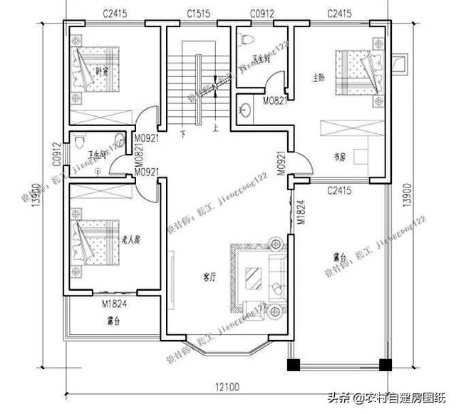 二层:设计有3间卧室,主卧室被设计成套间,有书房方便工作学习,并设有内卫,确保隐私。客厅和卧室和布局和一楼一样,客厅有推拉门通向屋顶露台
