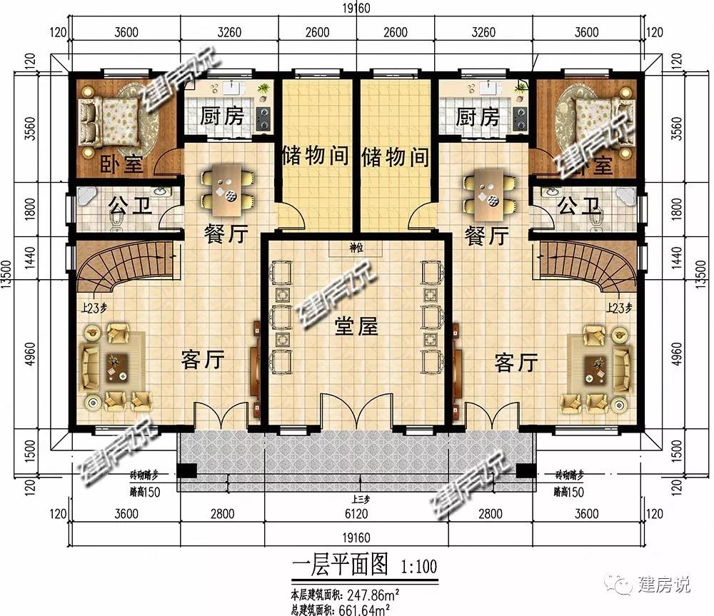 一层:堂屋符合大家族生活习俗;宽敞客厅方便招待亲友;厨房与餐厅相连,干净卫生;储物间方便存取杂物。