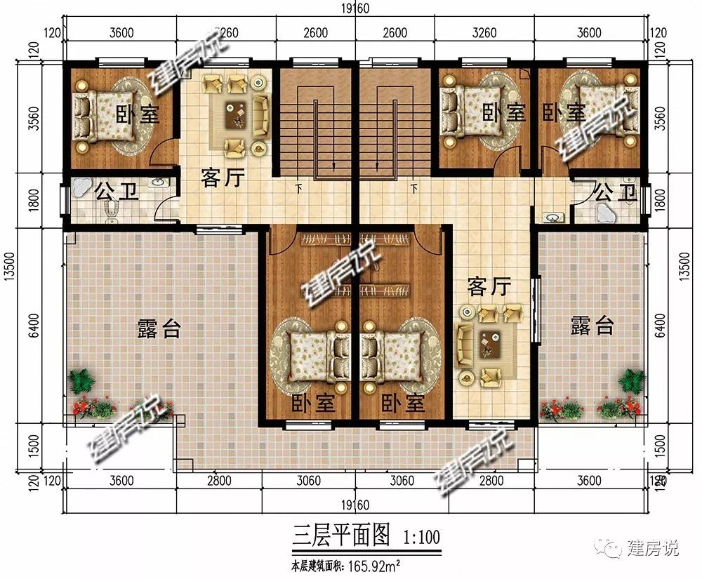 三层:宽敞露台适合晾晒衣物,种植花草;卧室设置充裕,满足2家人生活起居。