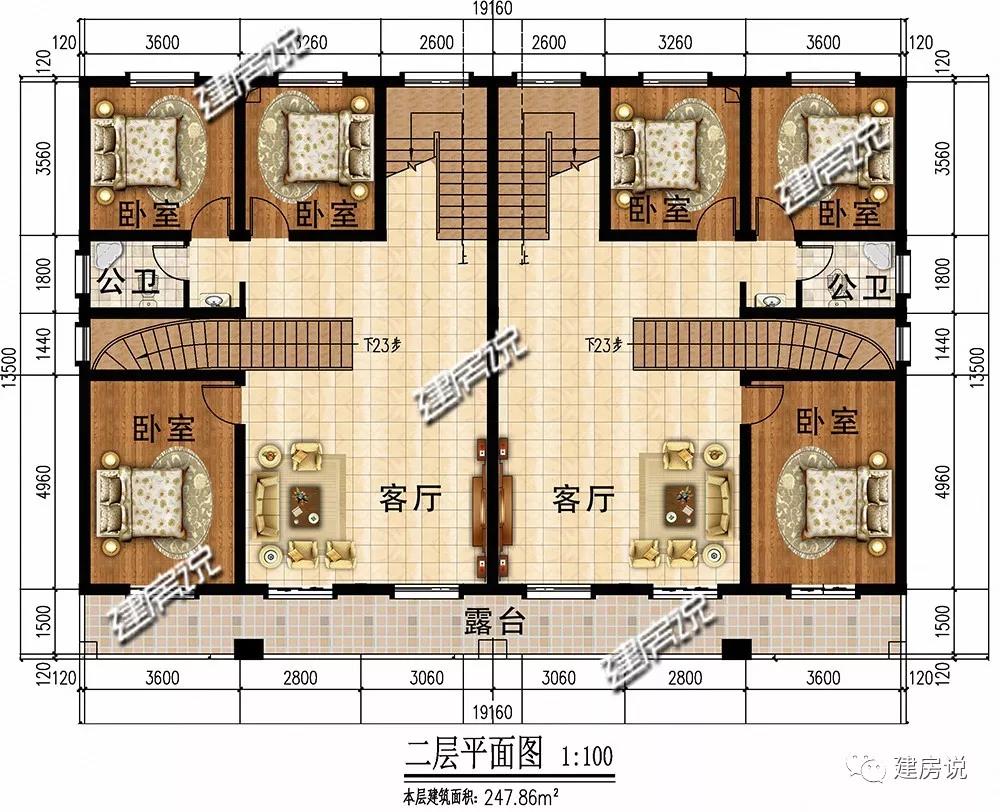 二层:宽敞客厅方便家人沟通感情,娱乐休闲;各设有3间卧室,大小合理;露台方便两家人走动联系。