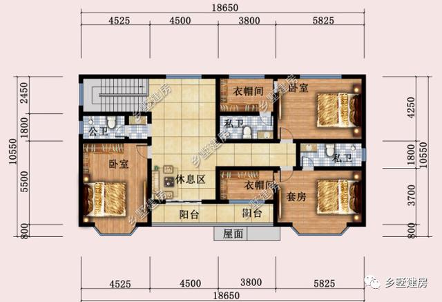 二层设有两间套房,一间卧室,三个卫生间,休息区,一个阳台。两间套房带有独卫和衣帽间,下方的套房靠南向,八角窗采光极好,衣帽间靠阳台,光照很足,减少湿气潮气。