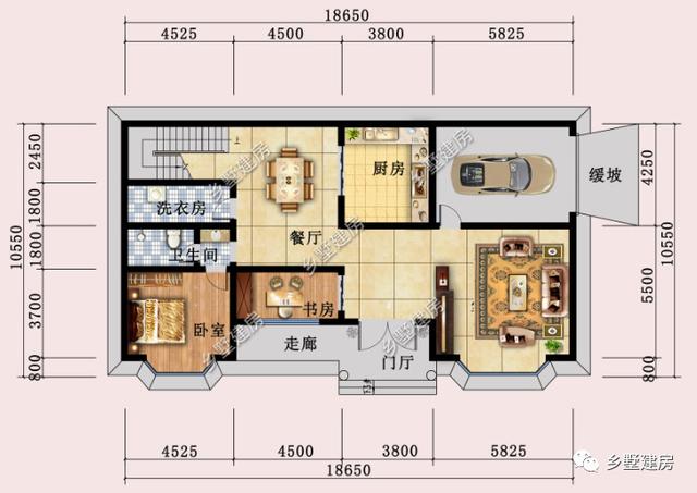 一层设有卧室,书房,客厅,车库,厨房,餐厅,洗衣房,卫生间。卧室和洗手间相邻,可以作为老人房,方便起居生活。