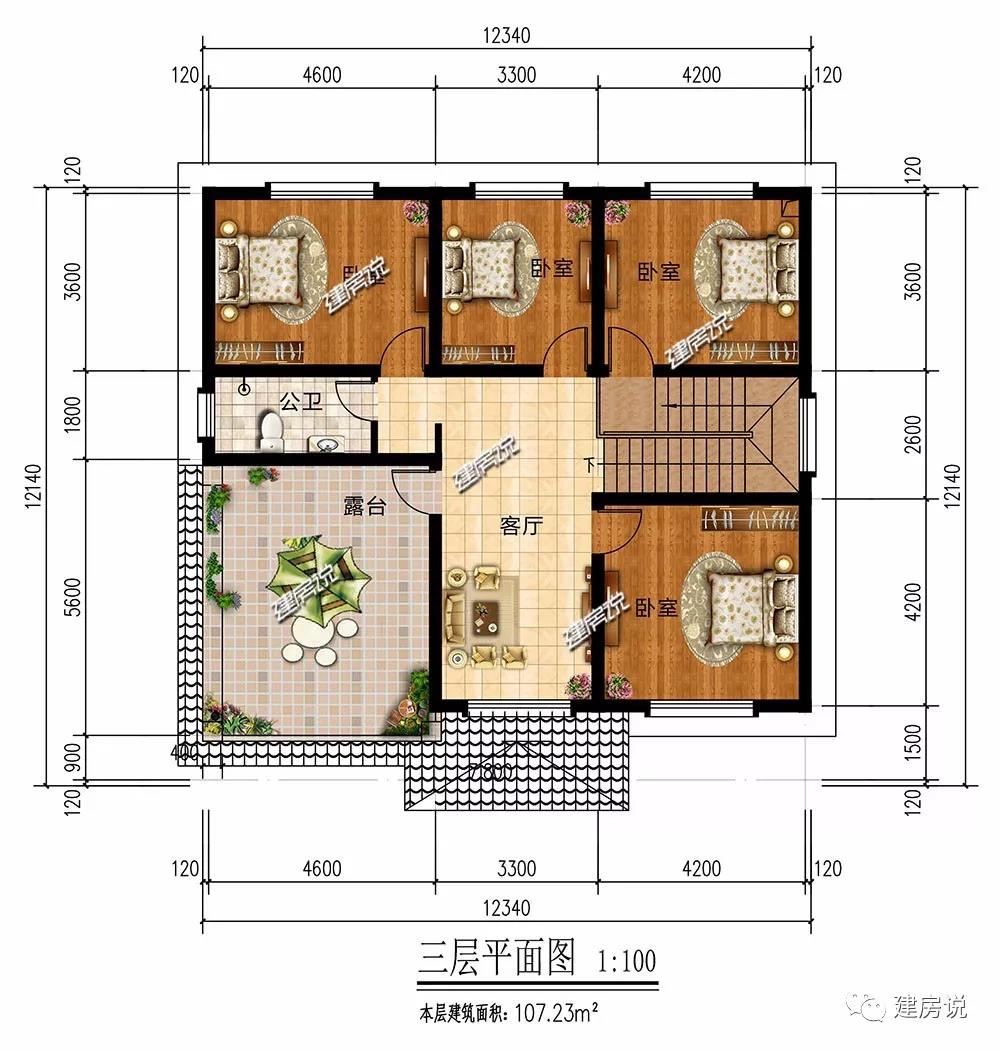 三层:4间卧室充裕,居住无忧,亲朋好友做客留宿也足够;宽敞露台满足晾晒,也可打造空中花园,欣赏乡村美景。