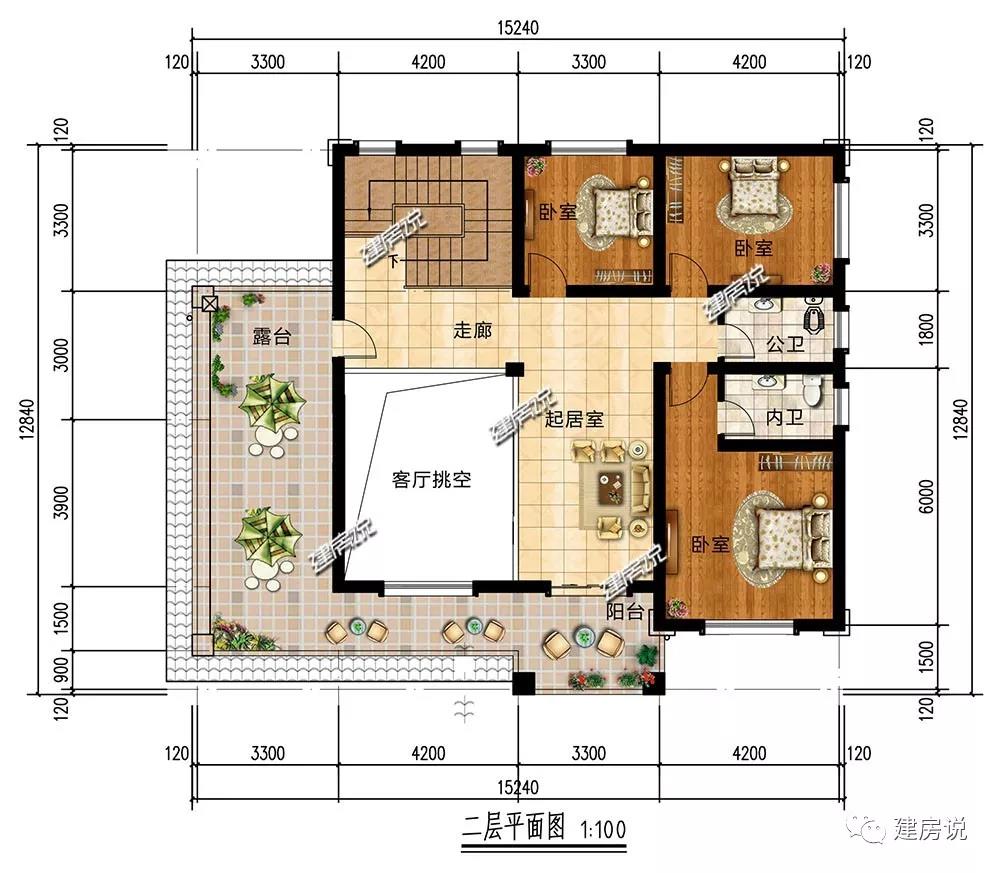 二层:挑空客厅,保证充足采光;起居室利于充实闲暇时光和提高生活品质;超大露台,利于通风采光,日常晾晒等。