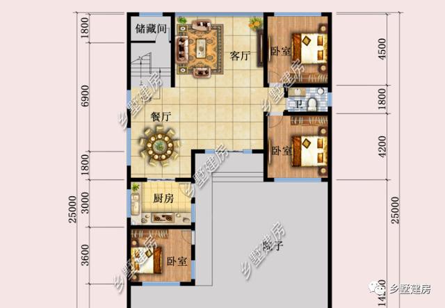 一层:设有三间卧室,客厅,厨房,餐厅,储藏间,公卫。偏房设有一间卧室,可作为客房。另外两间卧室设在正房右侧