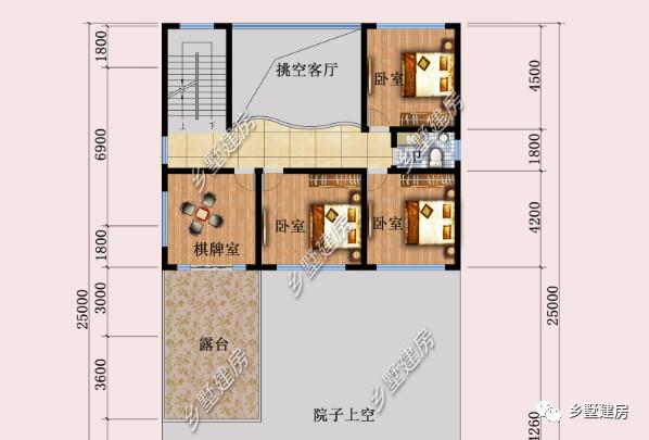 二层:设有三间卧室,一间棋牌室,一个露台,一间公卫。这层没有设计过多休闲区,一是主体面积较小,二是因为客房多的话更好的容纳来访的亲友。露台通过棋牌室连接,方便平时进出。