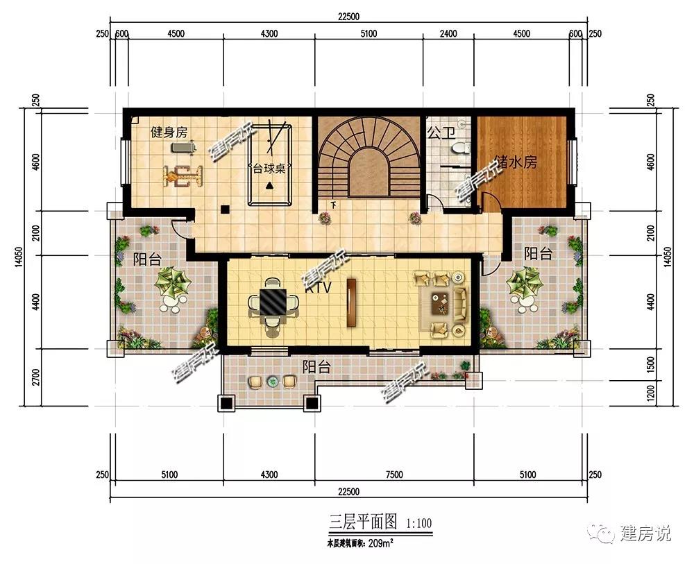 三层:健身房、台球桌及KTV满足日常娱乐;宽敞露台适合晾晒,种植花草,打造空中花园;配备储水间以备不时之需。