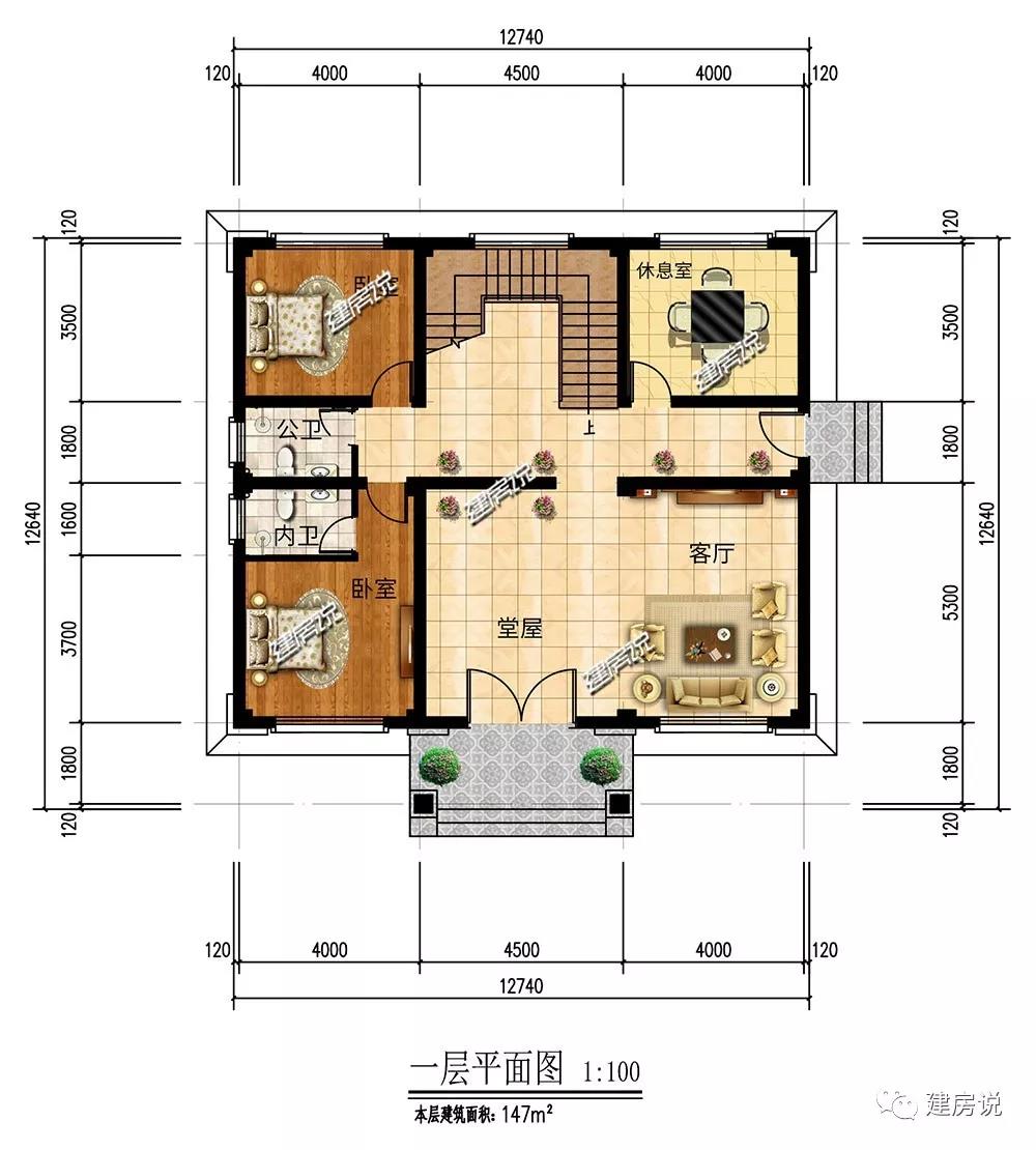 一层:入户是堂屋,符合农村生活习俗;客厅温馨舒适,可供家人休憩娱乐;休息室打发空闲时光;设有2间卧室,主次分明。