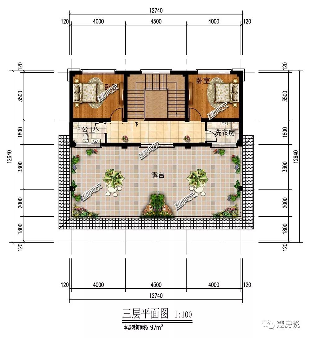 三层:设有2间卧室,大小合理;洗衣房和露台相连,方便晾晒;宽敞露台可以打造空中花园,露台烧烤。