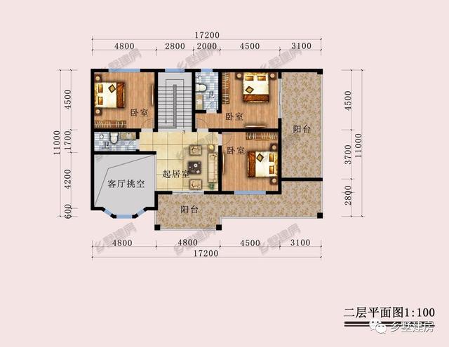 第二层平面图:第二层设有三卧室,两卫生间,起居室,阳台。