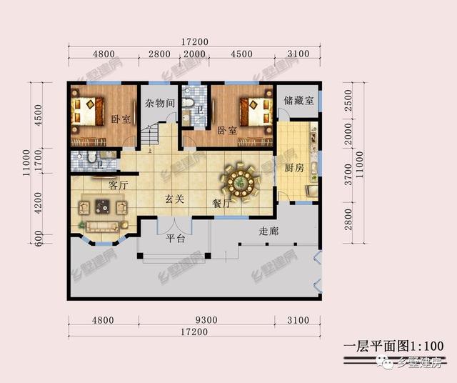 第一层平面图:设有走廊,平台,玄关,客厅,餐厅,厨房,两卧室,两卫生间,储藏室,杂物间。