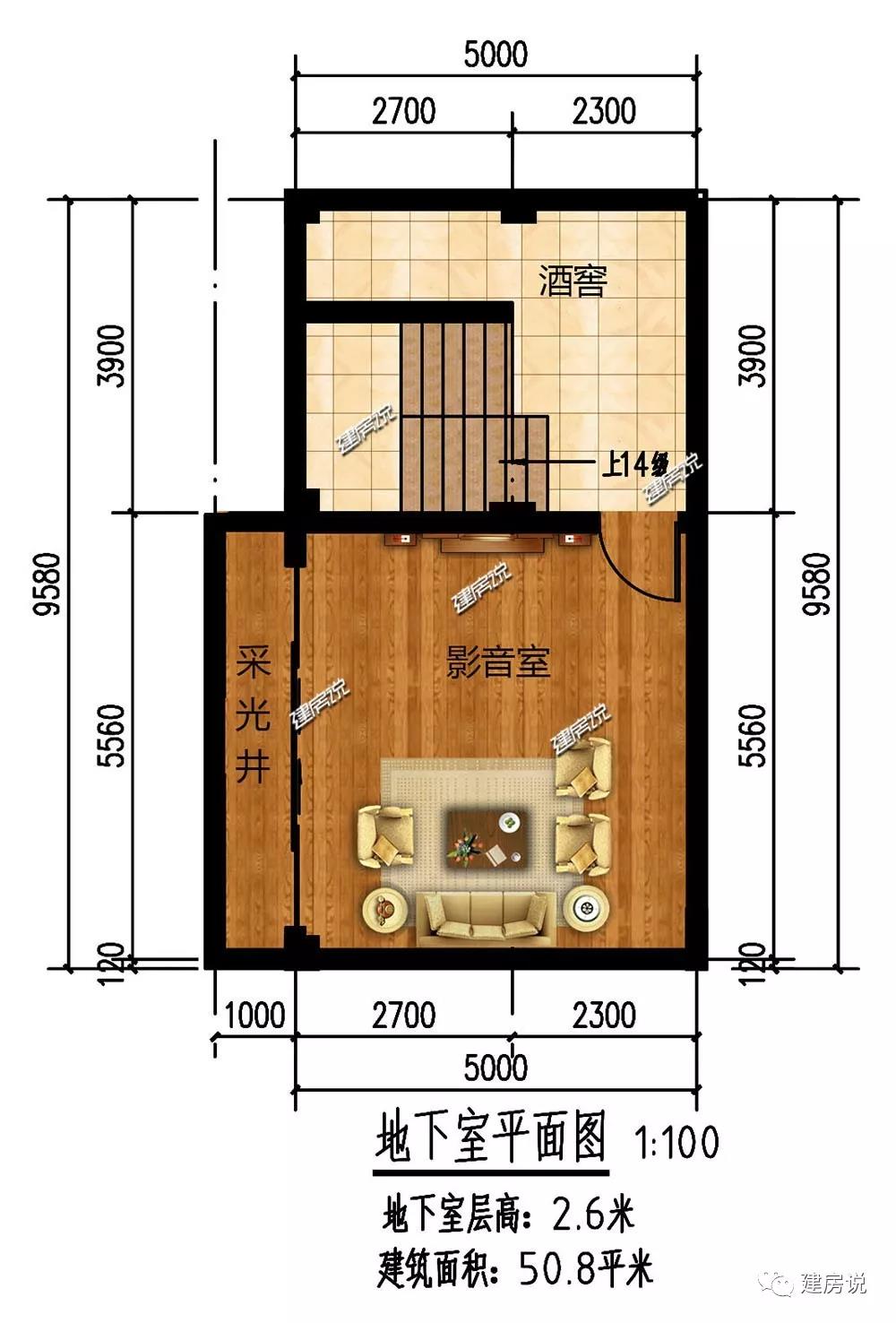 地下室:设有影音室,闲暇时刻可以跟家人一起看看电影,丰富娱乐生活;酒窑提升家庭的生活情调;采光井可以弥补地下室采光不足的缺陷。