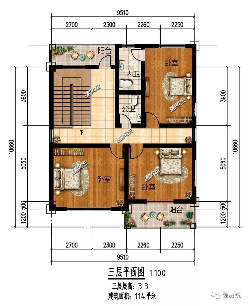 三层:设有3间卧室,大小合理,居住无忧;阳台满足晾晒,也可打造一个小小屋顶花园。