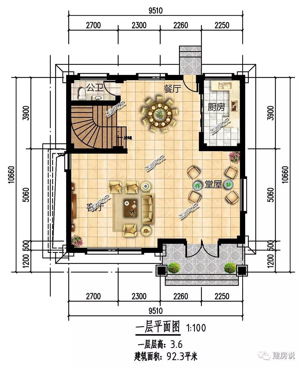 一层:入户即堂屋,符合农村的生活习俗;宽敞客厅,方便接待好友;餐厅与厨房在后,布局合理。