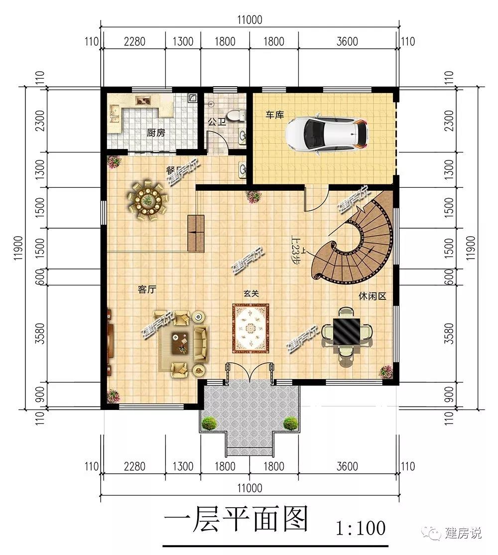 一层:入户即玄关,保护隐私;客厅和休闲厅,活动空间宽敞,方便招待亲友;车库在后,方便泊车用车。