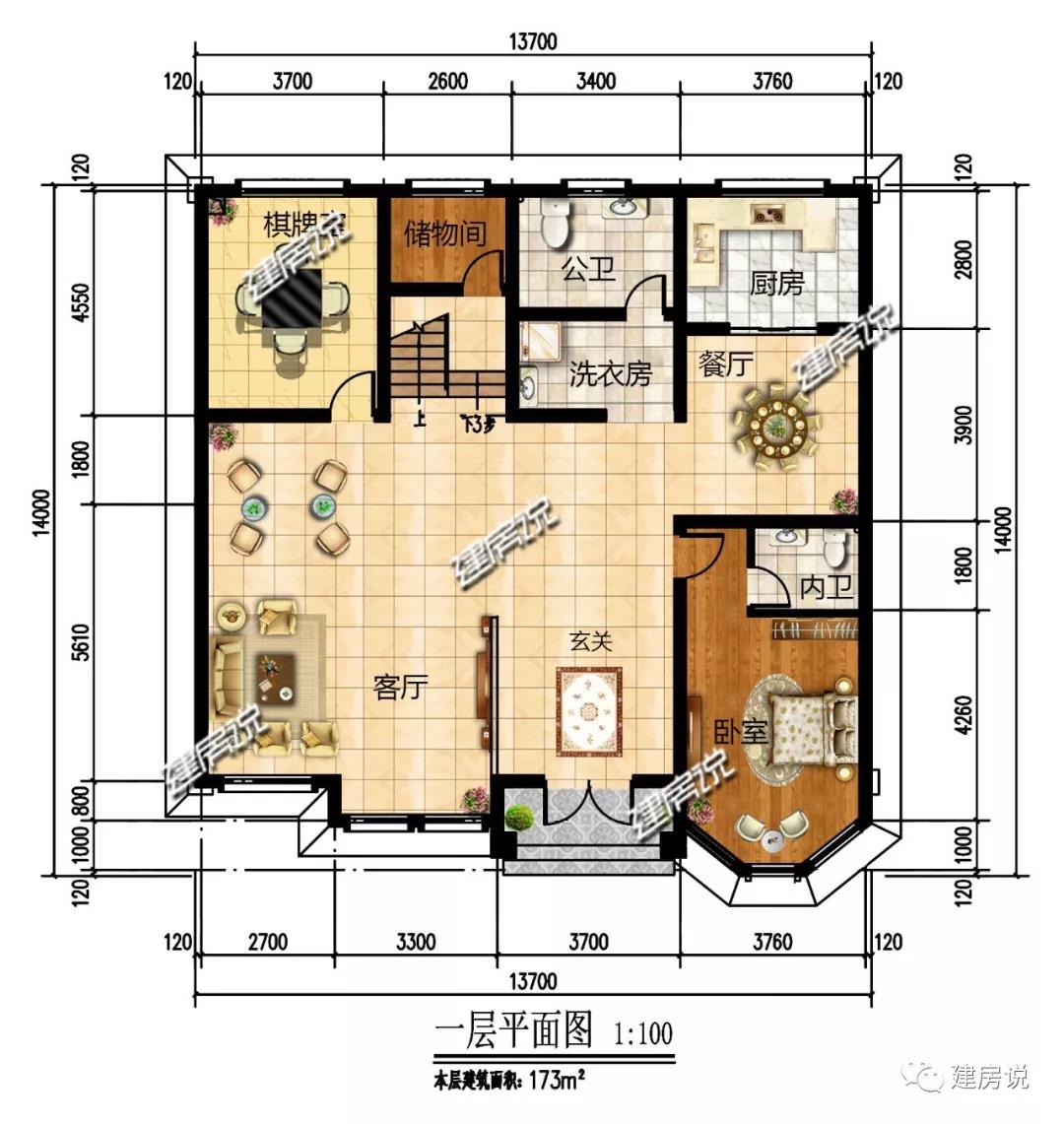一层:入户即玄关,保护隐私;客厅大气宽敞,采光效果好;独立洗衣房,日常生活无忧;棋牌室可供家人休闲娱乐。