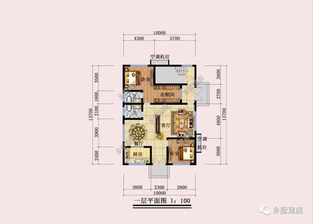 第一层平面图:客厅,厨房,餐厅,衣帽间,两卧室,两卫生间,衣帽间。