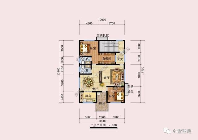 第二层平面图:设有客厅,餐厅,厨房,两卧室,两卫生间,衣帽间,玄关,阳台。