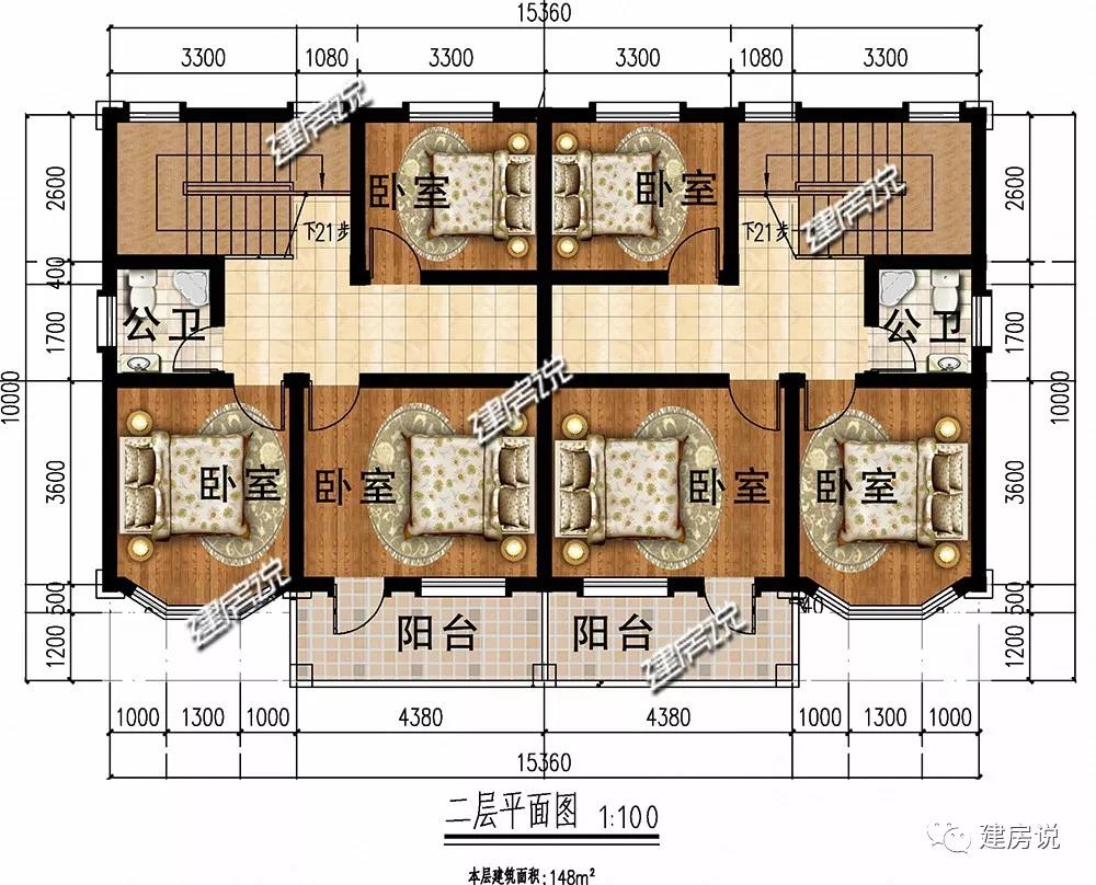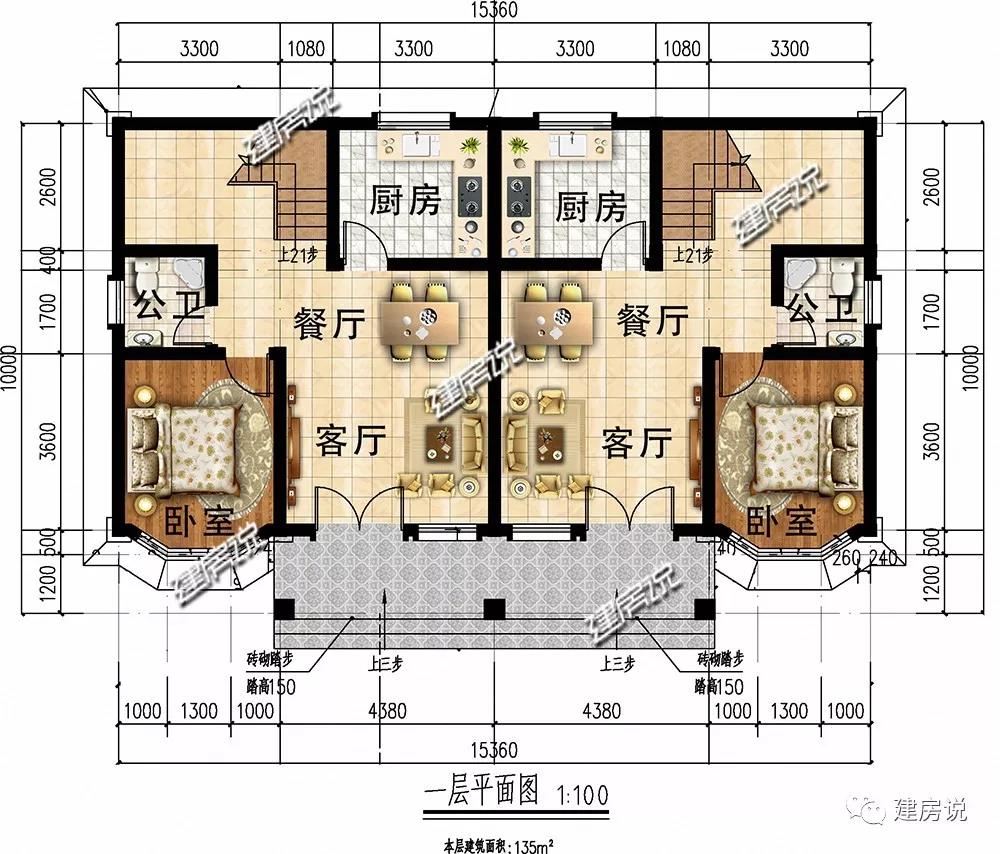 一层:入户2个大门进入室内,以一墙之隔,整体格局左右对称分布、温馨紧凑,可以居住2户家庭。