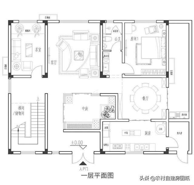 一层:有玄关要求的也可以放心的看这一款,通过玄关,进入里面还有一个中庭,可以当自己的小菜园或者小花园都可以。卧室,厕所,洗漱台,都有其独立的空间。有些地方的农村人民还保持着烧柴火的习惯,那么这一款也是非常合适的。厨房内设有单独的柴火房。