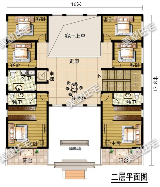 二层:设有两个主卧,四个客卧,休闲区,两个阳台和一个公卫;