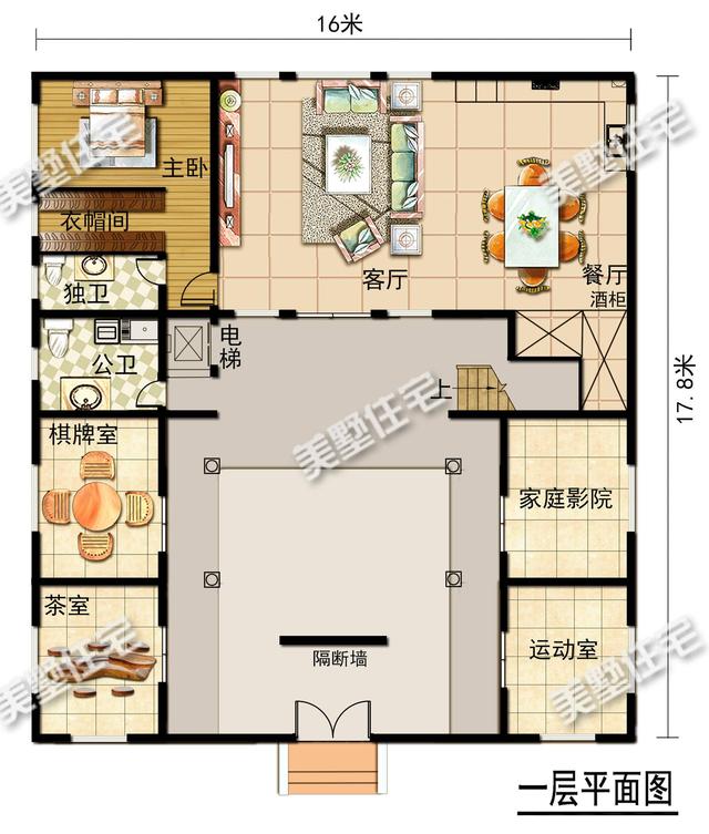 一层:入口设有隔断墙,增加了室内的私密性,将院子与室外隔断开来,让人想要探究里面的风景。其他设施有电梯,茶室,棋牌室,公卫,运动室,家庭影院,餐厅,客厅和一间带有独卫的卧室;