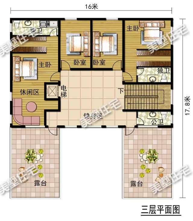 三层:设有两个大露台,休闲区,健身区,两个主卧和两个卧室。
