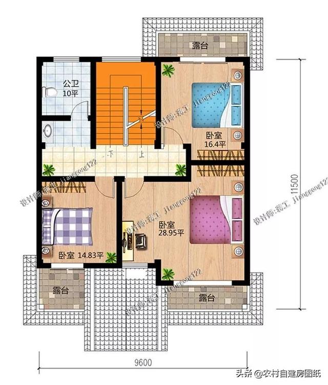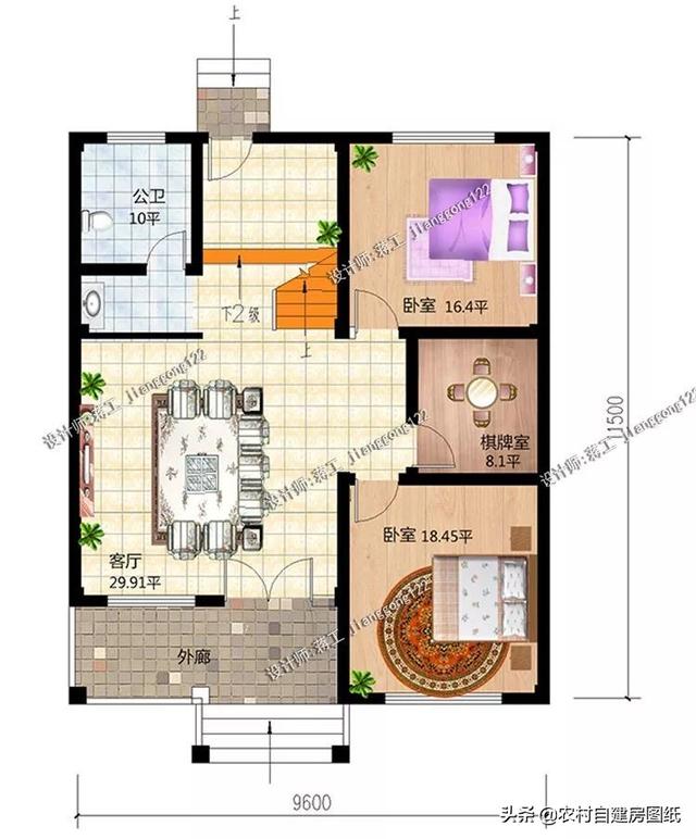 一层:进门则为客厅,厕所位置清晰可辨,不仅方便自家人上厕所还能方便客人找厕所,棋牌室则可以用来与家人,邻居之间的相互娱乐,在过年时也能很好的调动气氛。两间卧室,如果家里面有老人,可以考虑设置一间为老人间。