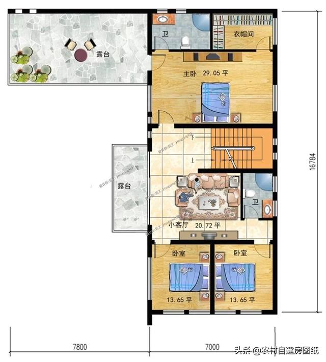 二层:小客厅,3卧室,2卫生间,2露台二楼的设计相对于一楼就主要还是一个休闲的地方,主卧附带衣帽间,内卫,这种套间式的设计,更适合年轻人的需求,两个大露台适合日常晾晒,种花养草,在休闲的时候,叫上三五个好友开个小party更是趣味十足。