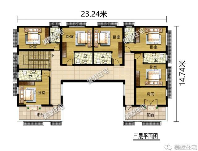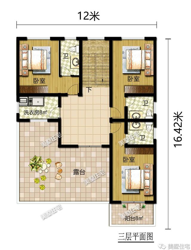 三层:有三室一厅三卫,外配大露台、阳台。