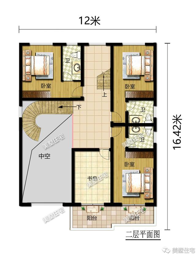 二层:三室一书房三卫,配开放式休闲区域,室外阳台