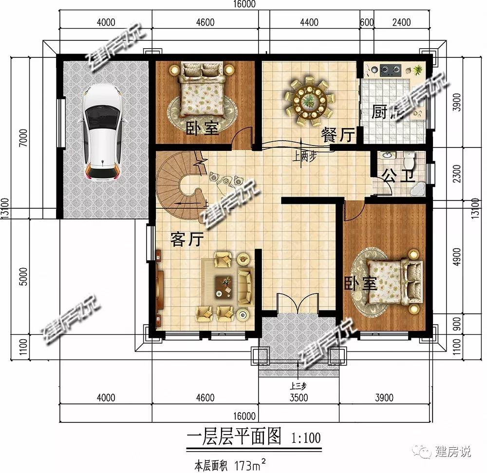 一层:入户设门厅,客厅的弧形楼梯,造型优美;配有车库,方便泊车和用车;厨房餐厅在后,洁污分区。