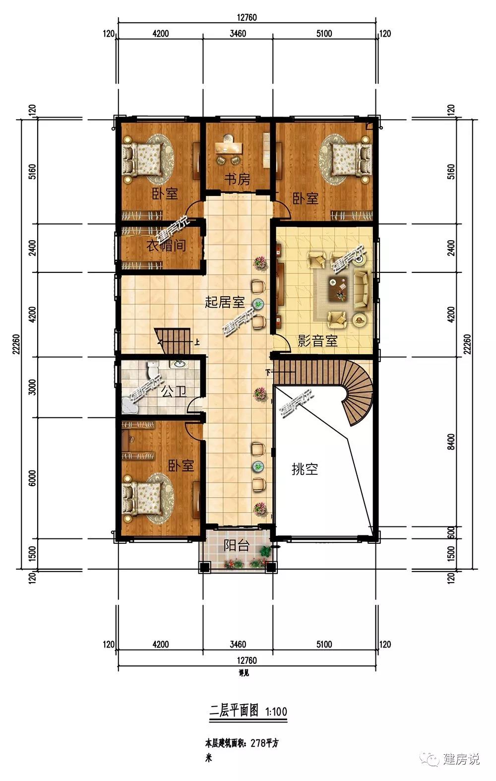二层:挑空客厅和旋转楼梯搭配,简直高大上;3个卧室大小适中;设有书房和影音室,学习和娱乐两不误。