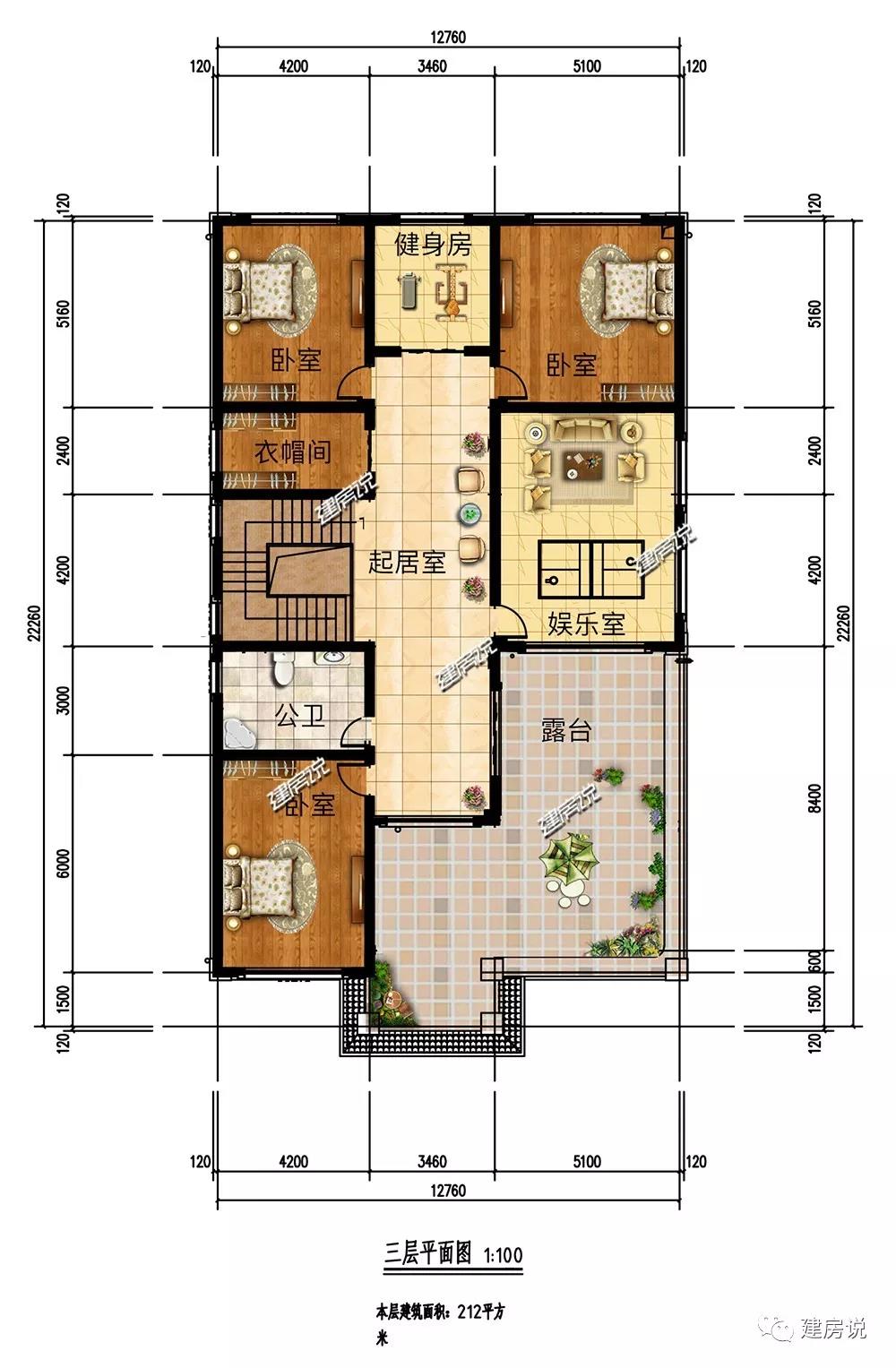 三层:卧室设置充裕,满足家人起居和客人留宿;健身房让家人养成健康的生活习惯;露台可打造空中花园,喝茶赏花,享受悠然的田园生活。