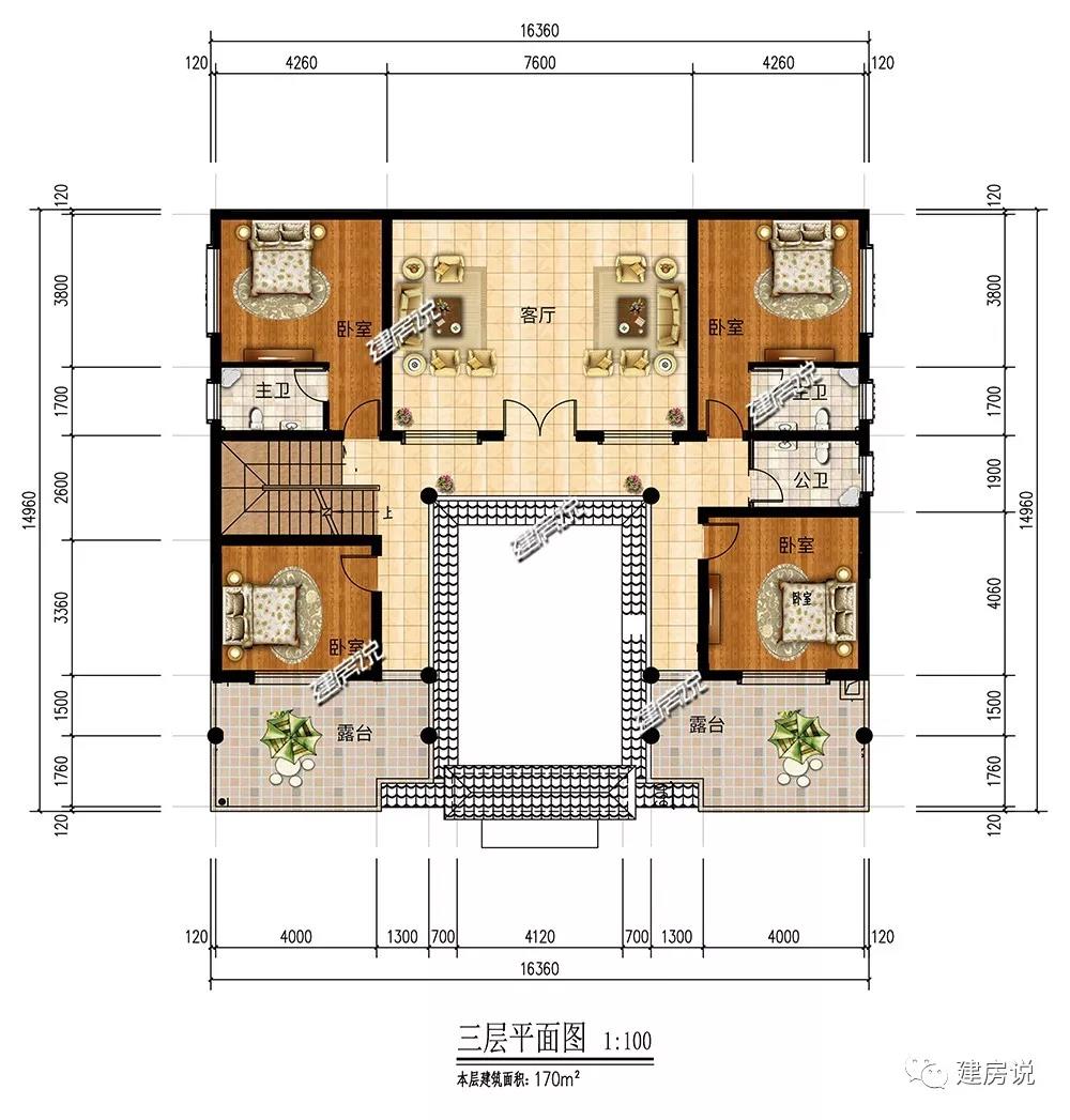 三层:宽敞的客厅,方便家人相聚;4个卧室大小适中,避免了门对门;2个露台,满足晾晒,饲鱼养花,或放上户外沙发,回归乡村生活的宁与静。