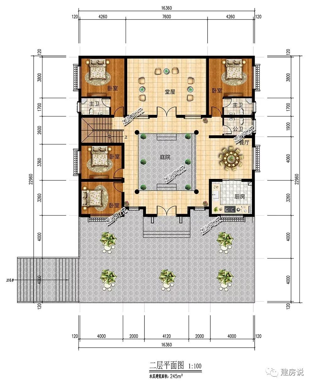 二层:堂屋符合农村生活习惯;餐厅厨房位于东南角,布局合理;4间卧室,居住空间充裕,方便自住和出租。