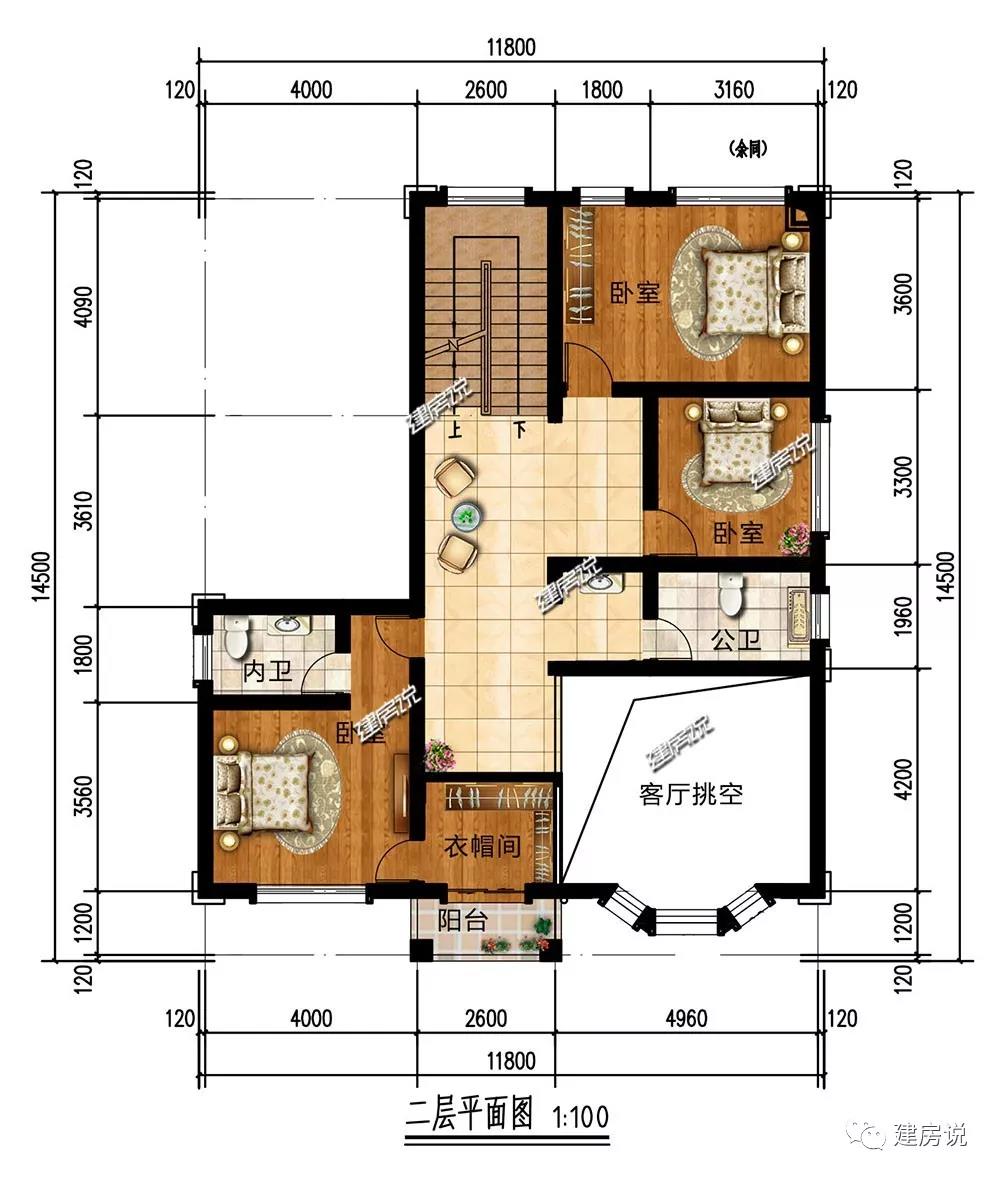 二层:3间卧室主次分明,主卧带内卫、衣帽间和阳台,温暖舒适;挑空客厅,开阔视野,提升别墅空间感。