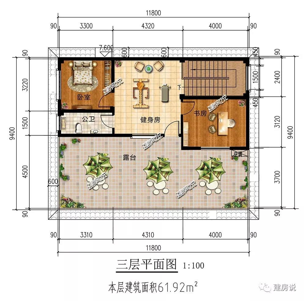 三层:1个卧室和书房,实用紧凑,方便工作看书;健身房,为平时锻炼身体提供了绝佳的场所;大露台通透明亮,可做为家庭聚会、烧烤的场所,也可做空中花园。