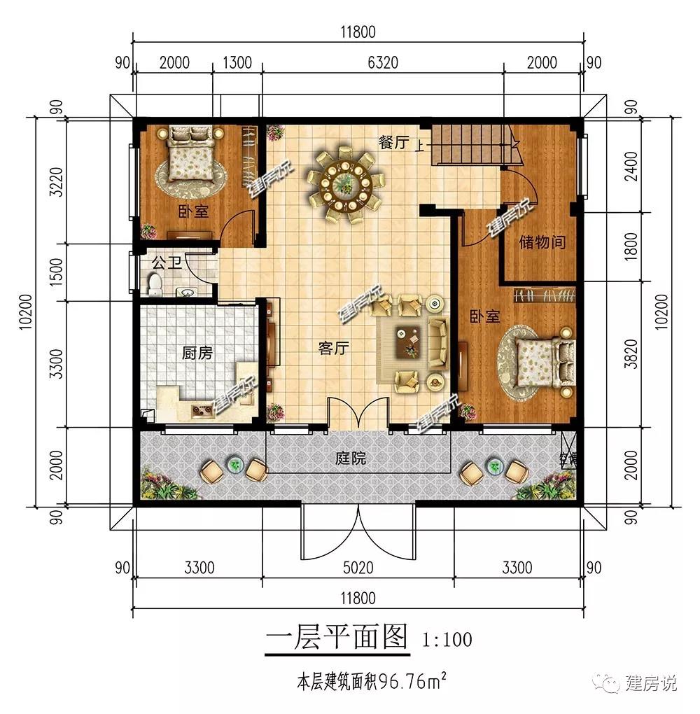 一层:进门设庭院,可种种花草,喝喝茶,休闲活动;室内布局合理有序,满足家人起居。