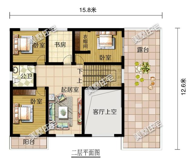 二层:设有起居室,书房,阳台,大露台以及三间卧室