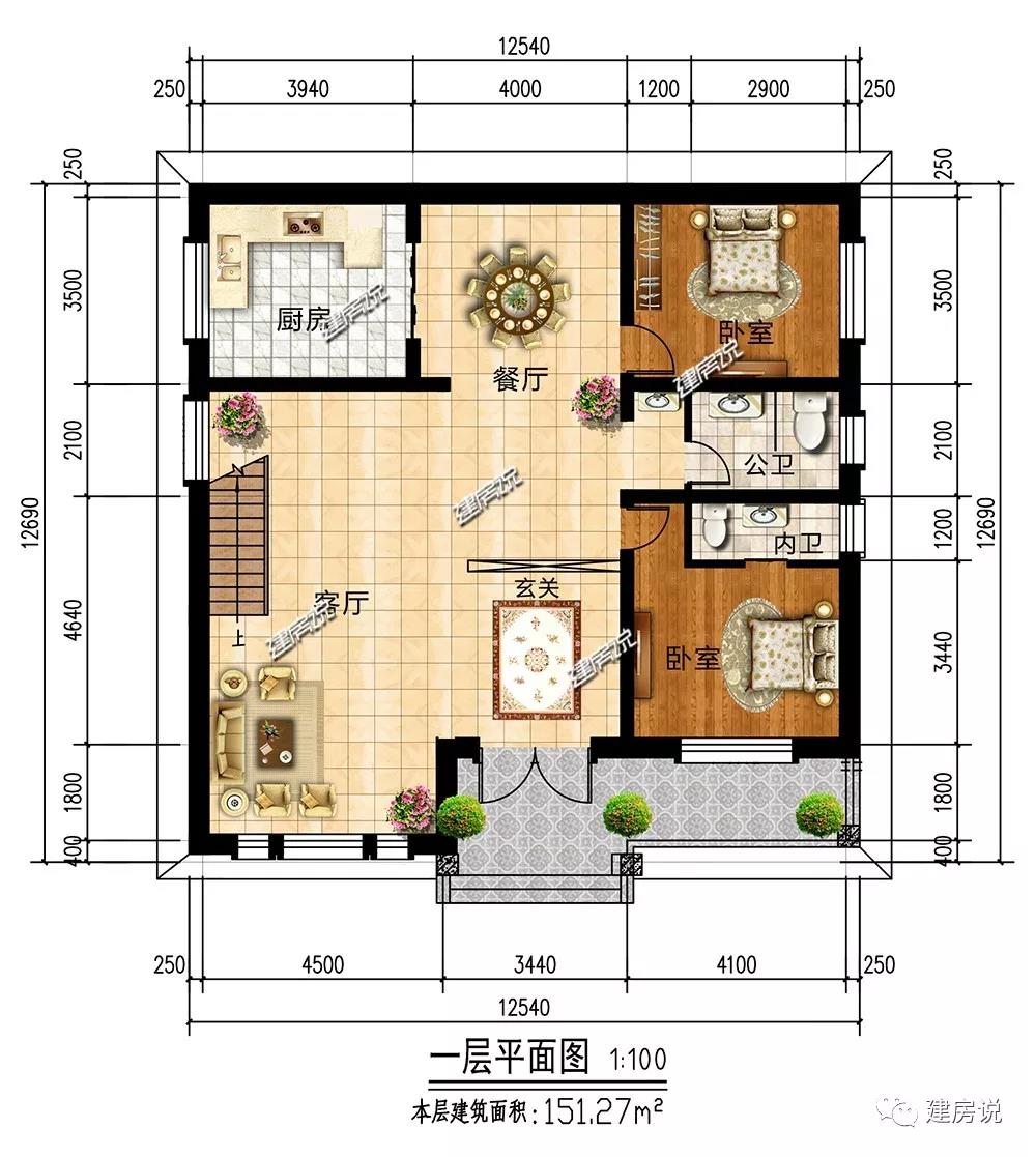 一层:入户设玄关,保护隐私;宽敞客厅,满足家人闲暇休憩;2间卧室安静舒适;厨房、餐厅设在后方,方便合理。