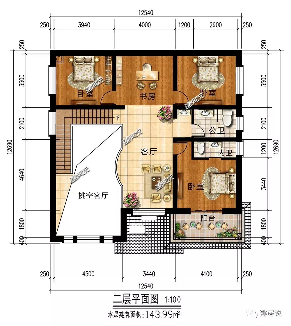 二层:3间卧室,主次分明,主卧设阳台通风采光好;挑空客厅,开阔视野;设书房,给家中增添书香气。