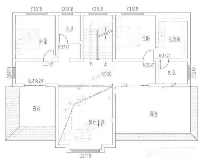 二层:2露台,卧室,公共卫生间,主卧(附衣帽间,内卫)