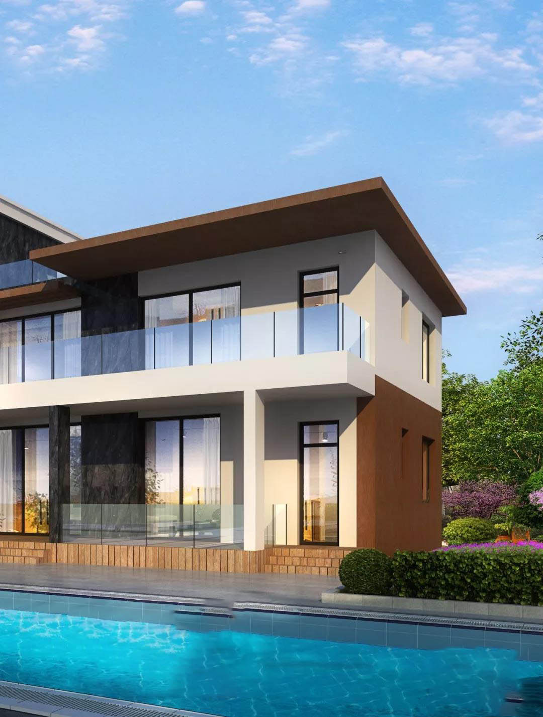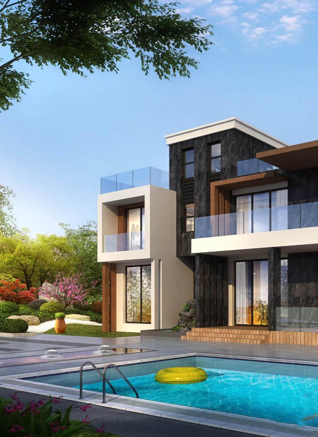 别墅外墙主体以白色真石漆为主,木纹色真石漆和黑色大理石搭配装饰,多窗多露台,年轻时尚。