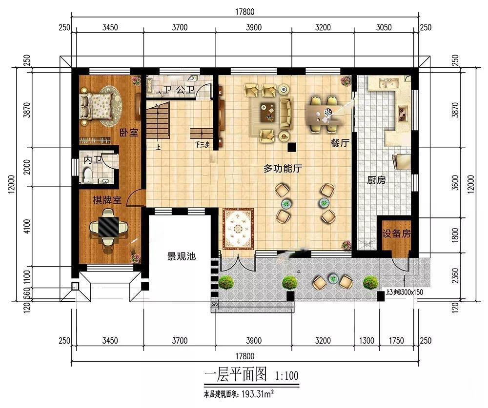 一层:户外设观景池和休闲区,提升别墅格调,丰富生活情趣;室内空间宽敞,洁污分区,满足生活和娱乐需求,轻松自在。