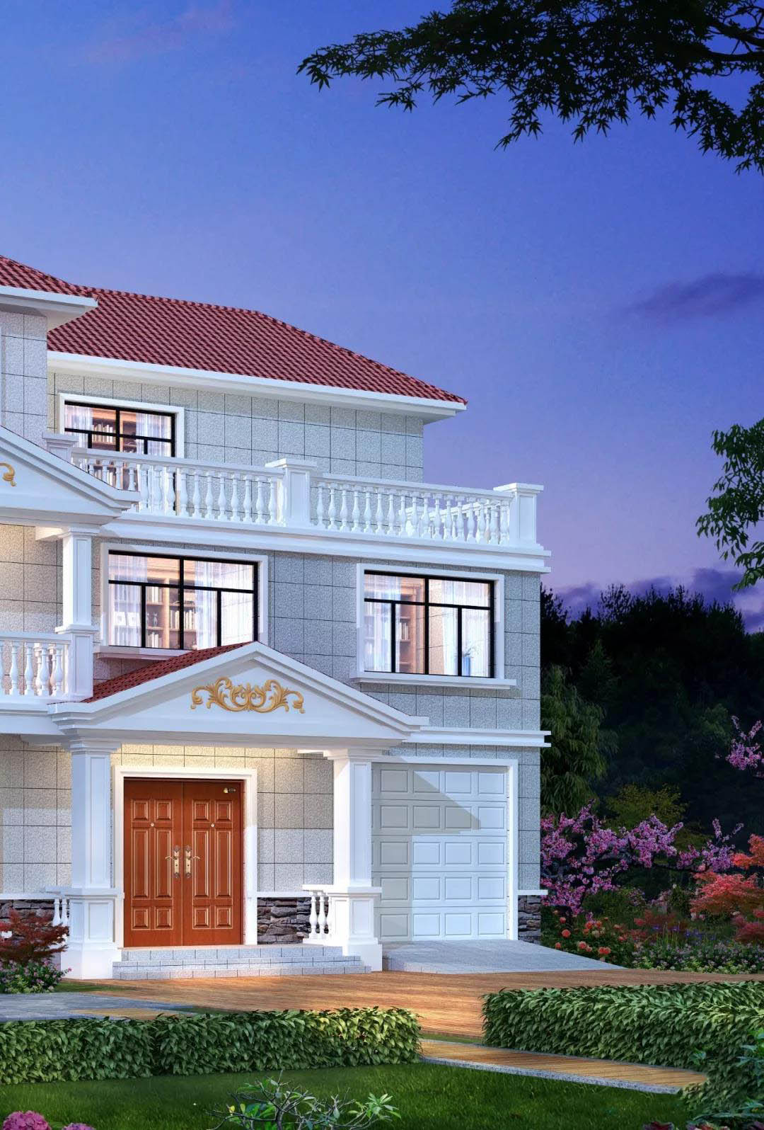 别墅外墙主体白色真石漆为主,做了线条的处理,层次感丰富,屋顶是红色西班牙瓦,金色的山花点缀,整体造型精致又耐看。
