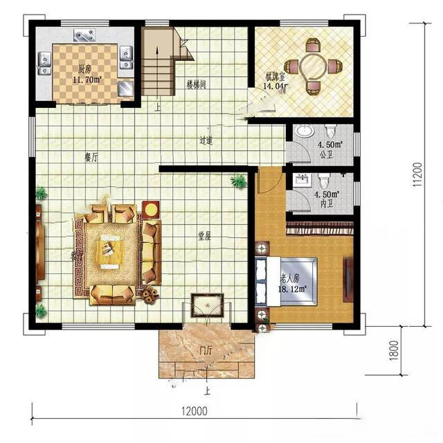 一层:堂屋,餐厅,厨房,棋牌室,老人房(附内卫),公卫一层保留了农村传统的堂屋,满足日常需要,整个大厅的空间比较大,一楼设计有老人房,带独立内卫,方便日常起居。棋牌室,也可以供老人娱乐休闲。