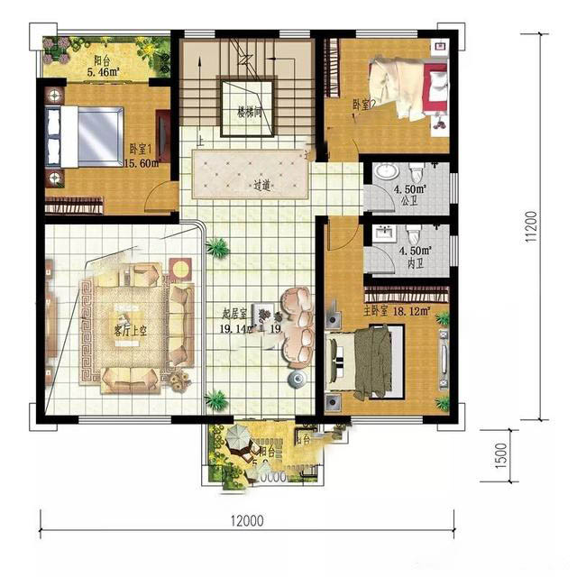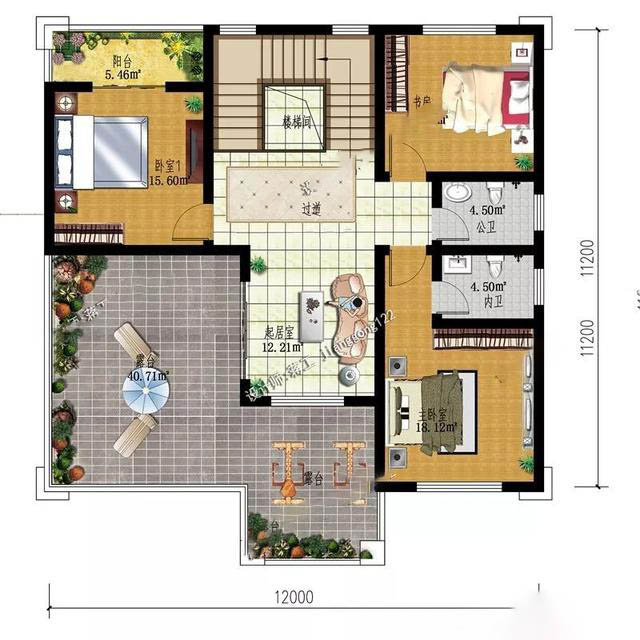 三层:卧室(附阳台),卧室(附带卫生间),起居室,露台同样三楼,设计有三个卧室,一个起居室,大露台的设计,可以作为一个休闲,娱乐,晾晒的空间。